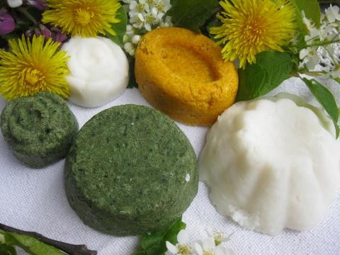 Die Pulver vermischen, Öl, äth. Öl und so viel Hydrolat dazu, dass eine Masse wie nasser Sand entsteht, die Masse muß halten, wenn man in der Hand einen Knödel drückt. Schnell arbeiten, damit es nicht im Topf fest wird. In Formen drücken oder Kugeln formen.